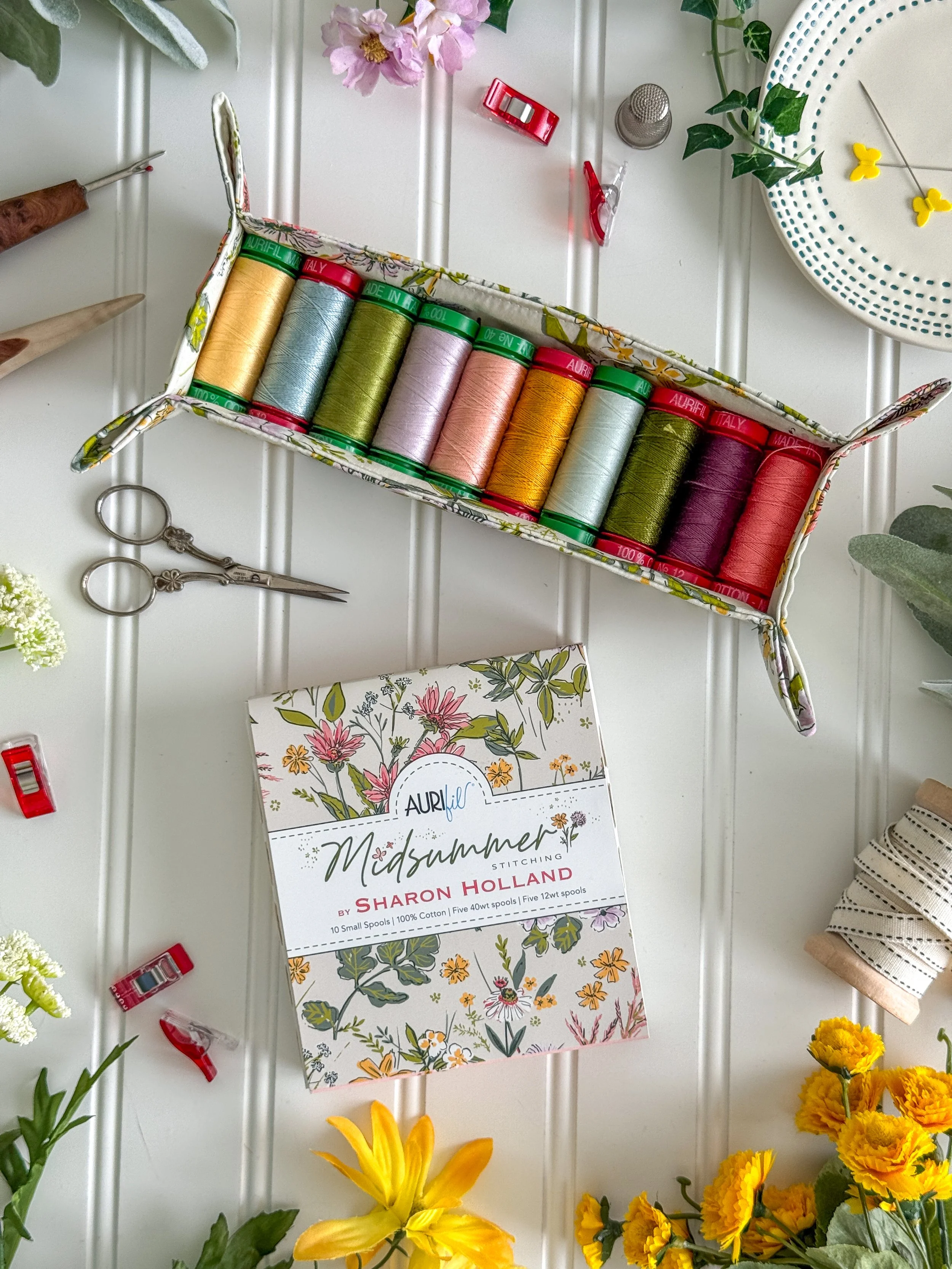 Come back to visit this website on Monday, April 27th, 2026 because I’ll be adding a brand-new tutorial to the Tutorials page of this website that shows how to make a perfectly sized fabric tray designed to neatly hold 10 Aurifil small spools, like the spools included in my Aurifil Midsummer Stitching thread set. You’ll love how much more organized and tidy your sewing room will be with a dedicated place for those little spools. If you’re on Instagram, follow me there as well so you’ll never miss a thing. When you follow my account @sharonhollanddesigns on Instagram you’ll find a steady, daily dose of Sharon Holland Designs updates — keeping you informed about upcoming pattern releases, new fabric collections, and more — including Reels and a special fabric tray companion video tutorial highlight on my Instagram on the 27th.