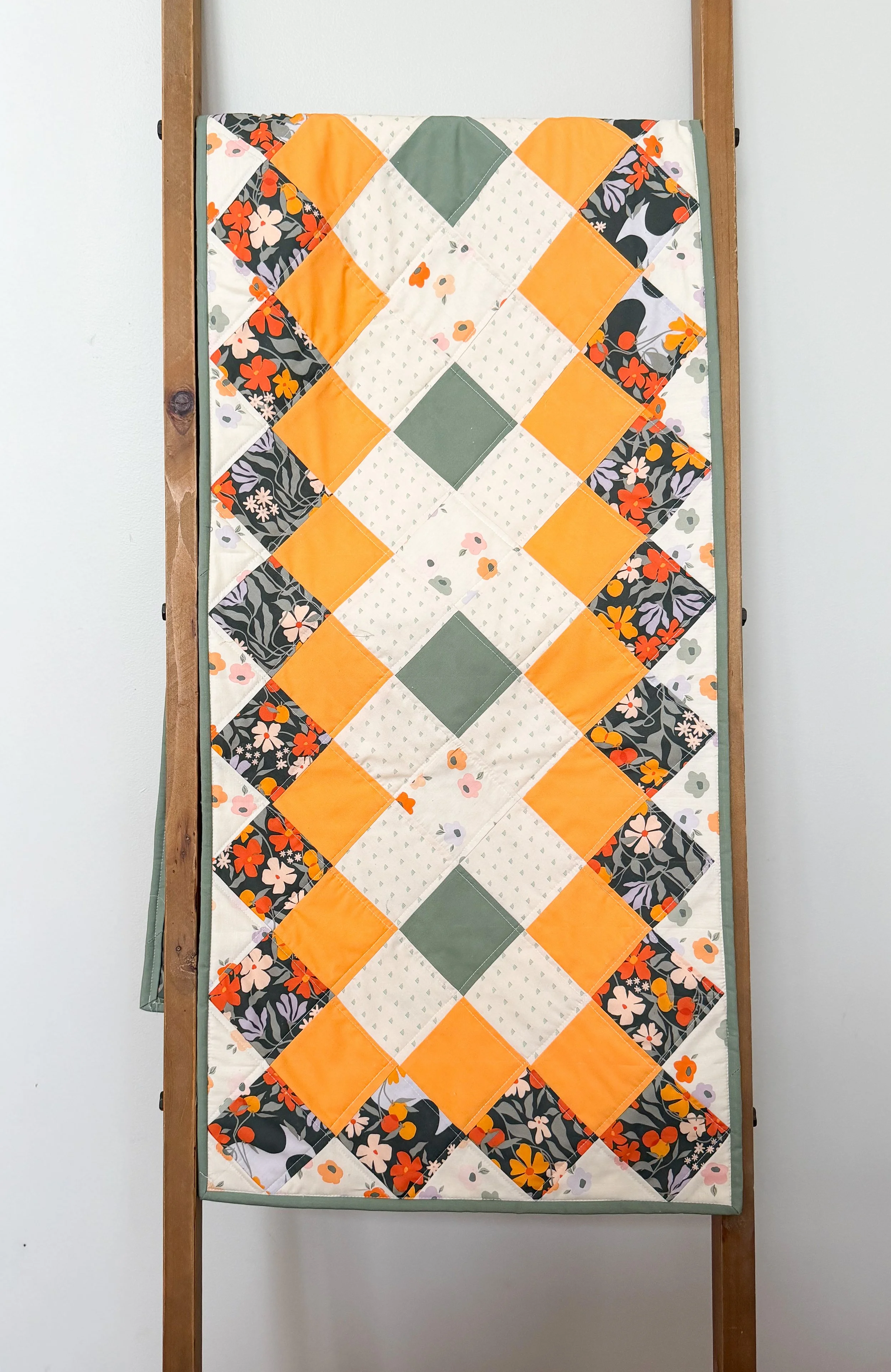 To show just how versatile this pattern is for any season, my pattern tester Victoria Newmyer of Midlife Quilter has made a summer version of the Homecoming Table Runner pattern using prints from the Art Gallery Fabrics Tangerine collection curated with some AGF prints by Suzy Quilts.