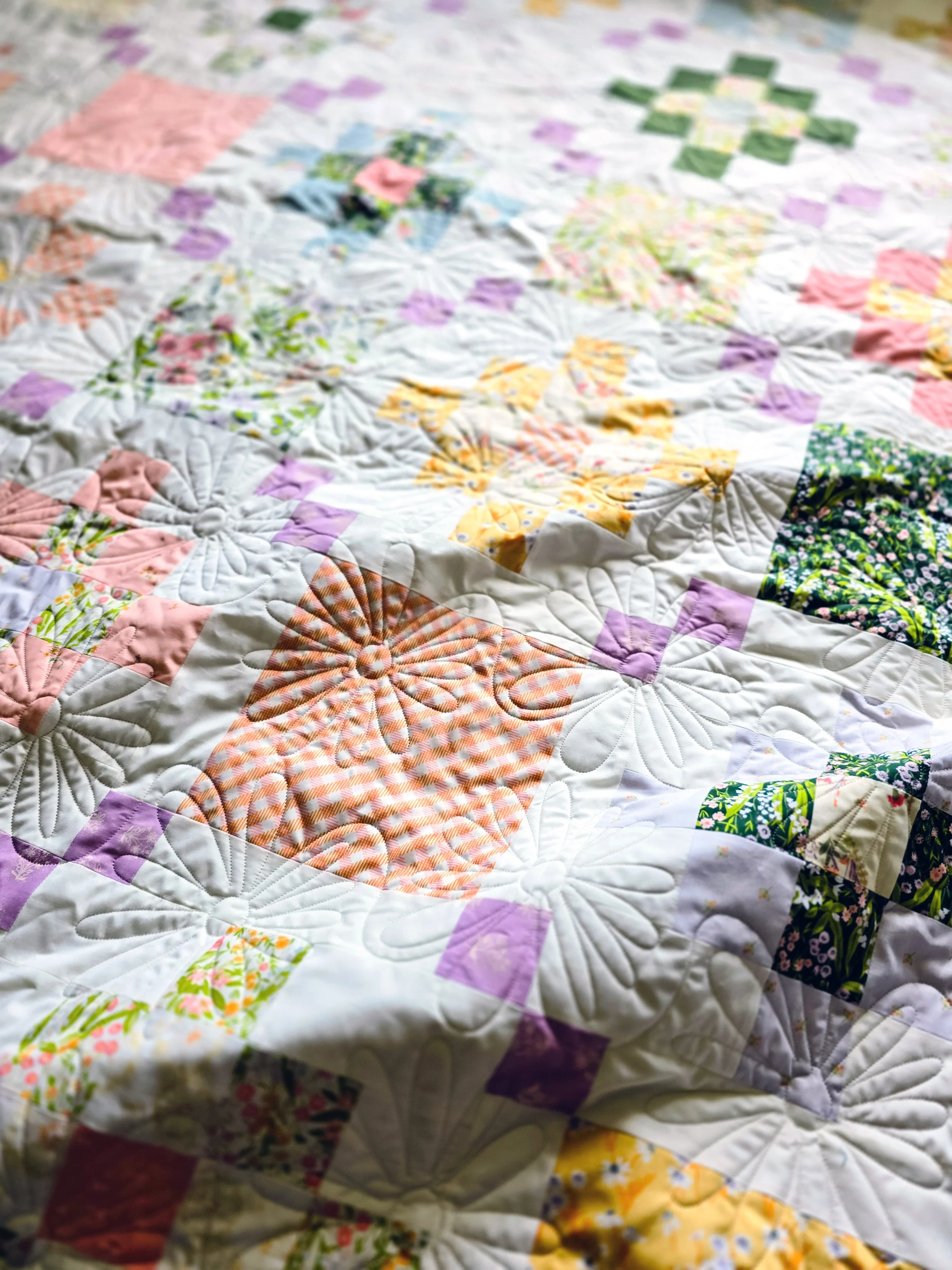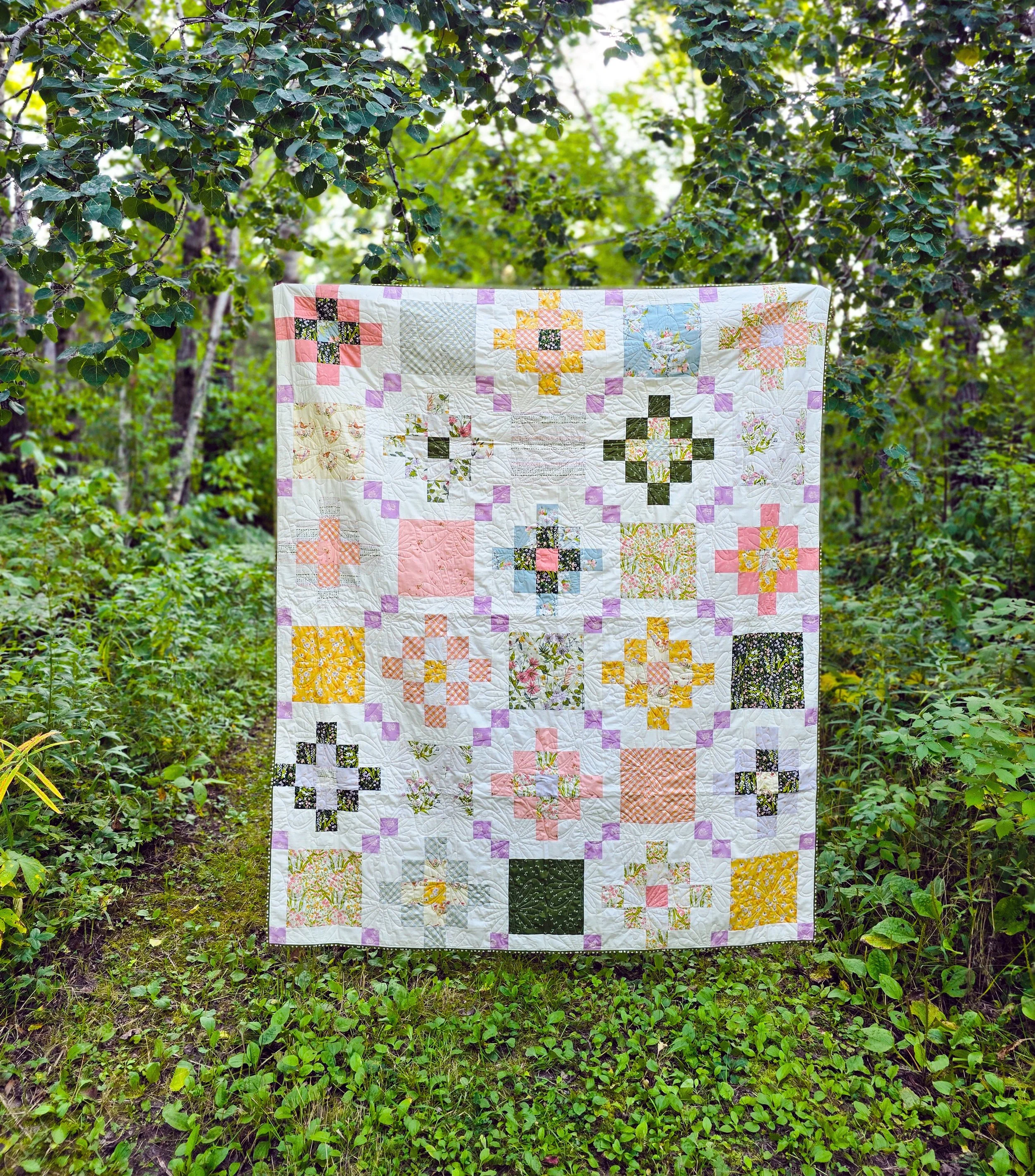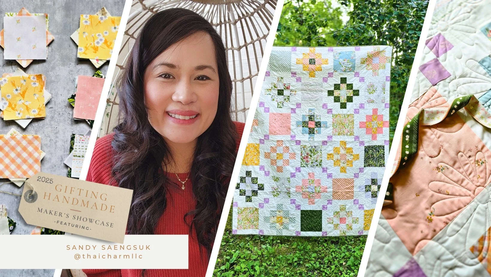 On DAY 10 of the Gifting Handmade Maker’s Showcase, Sandy Saengsuk of @thaicharmllc on Instagram shows off how masterfully she mixes numerous prints into her quilts. Sandy used a 16-pc fat quarter of the Art Gallery Fabrics Midsummer quilting cottons in her Meadow Patch quilt.