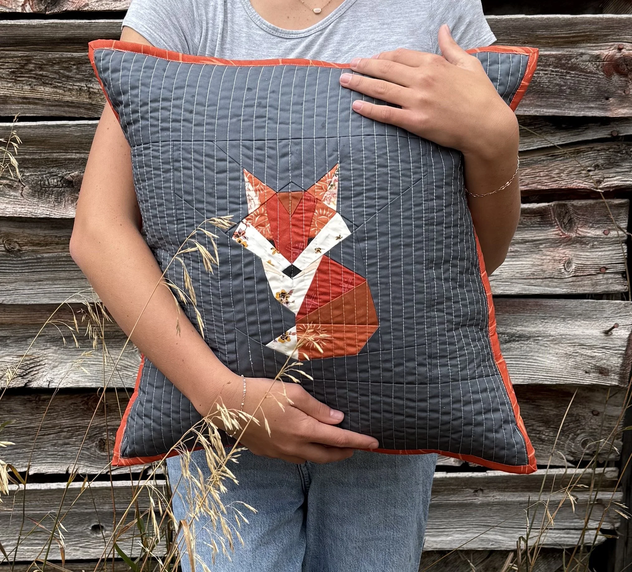 Mary purchased the @easypiecepatterns foundation paper-piecing Fox pattern from Easy Piece Patterns Etsy shop, HERE and made the 10” square fox block then added 4-1/2” borders around the FPP fox to end up with a lovely 18” square pillow with an envelope closure backing.