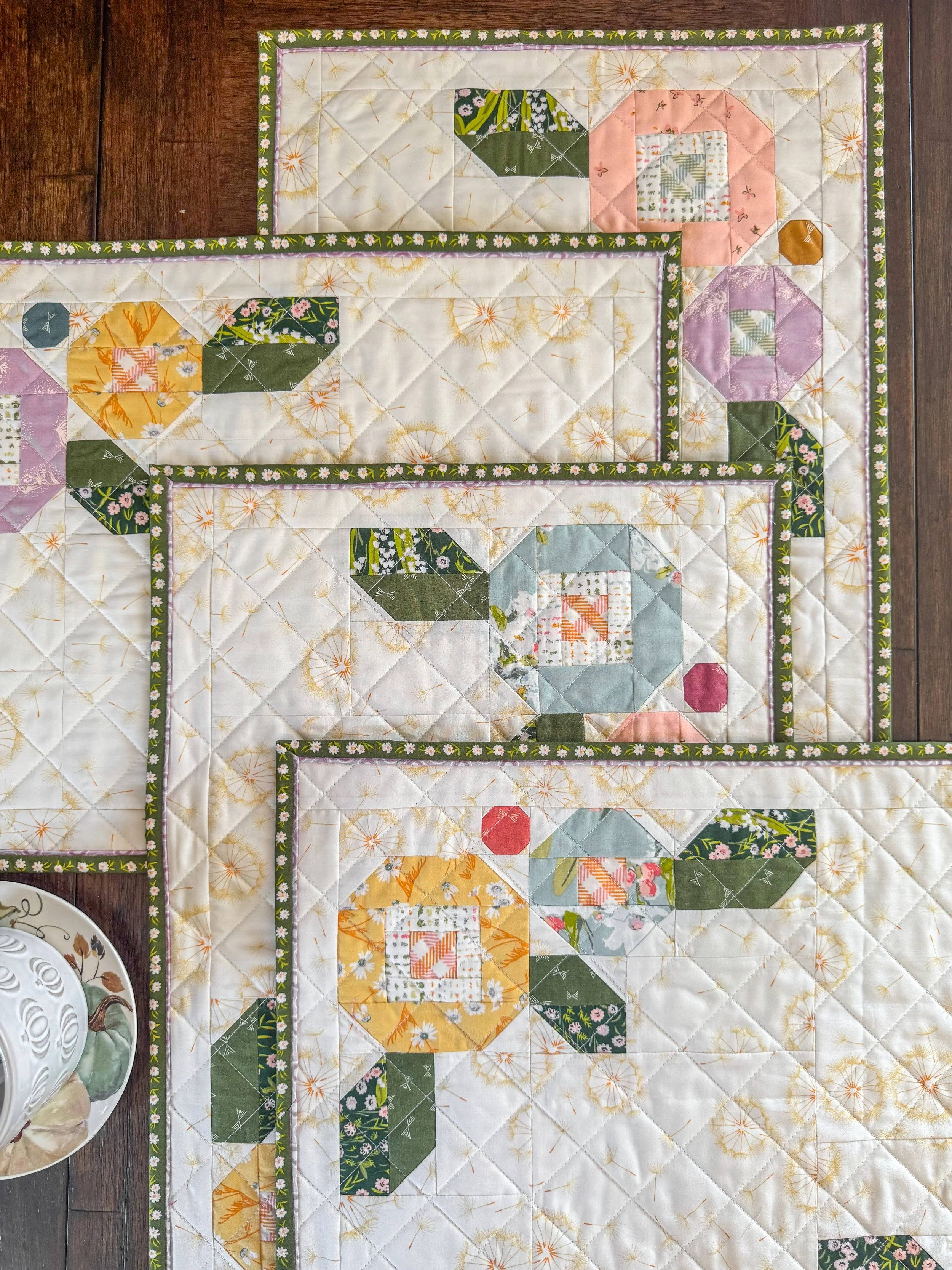 This runner and placemat set would be beautiful any time of the year and is pieced all from patchwork pieces but you could always add some embroidery details to the flowers and leaves to take it over the top with pretty perfection!