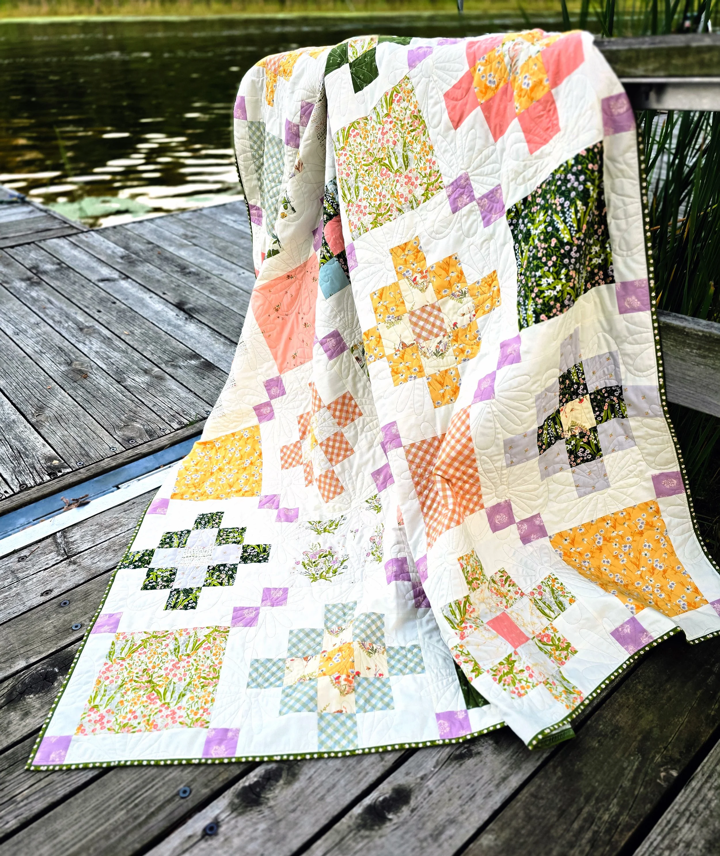 This gorgeous Meadow Patch quilt by Sandy was originally written for a Layer Cake bundle, but she adapted the pattern to stitch up this version using a Midsummer fat quarter bundle. “It works beautifully as long as you’ve got the full 18" width in each fat quarter,” notes Sandy. Meadow Patch has always been her go-to pattern for its generous size and how quickly it comes together. It’s the kind of quilt you can whip up over a weekend, making it the perfect handmade gift for the holiday season (or any special occasion)!