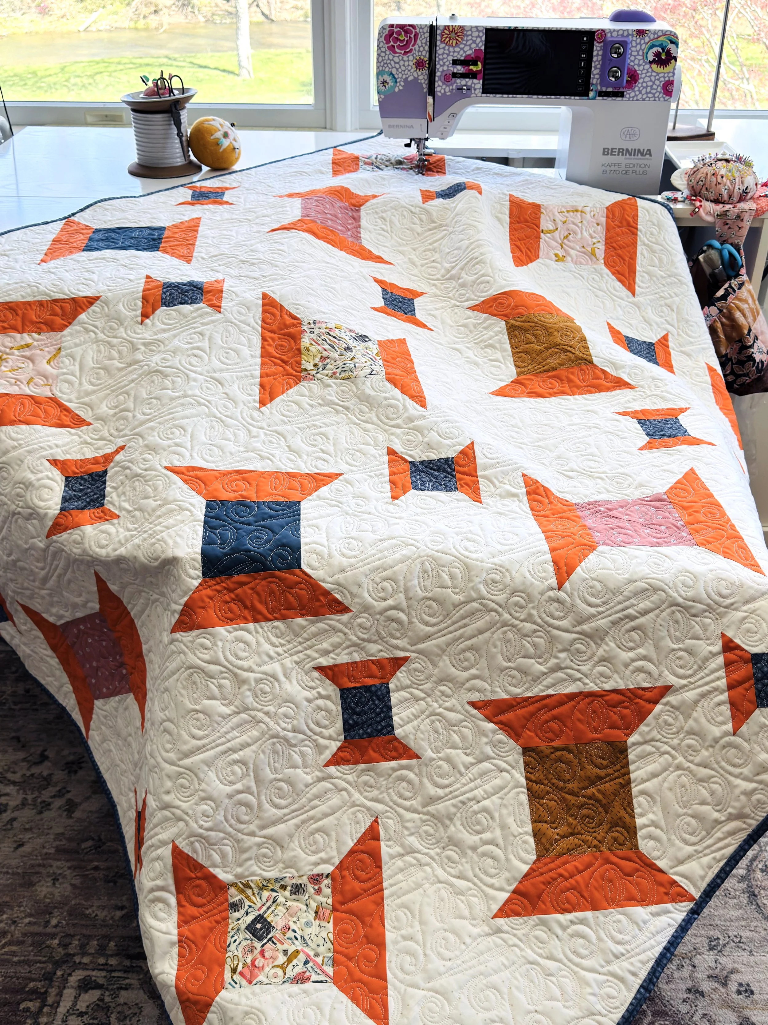 Joyce’s work is consistently flawless, and she also does the long arm quilting on all of her quilts, always selecting the perfect pantograph design that complements her pieces perfectly. You can see more of Joyce’s work on Instagram @evamaescustomquilts, Etsy shop, and on her Facebook blog HERE. You can commission your quilts to be long armed by Joyce. I have used her services many times to quilt my own quilts, and she is always wonderful to work with! Her skill and attention to detail ensure that each quilt turns out beautifully.