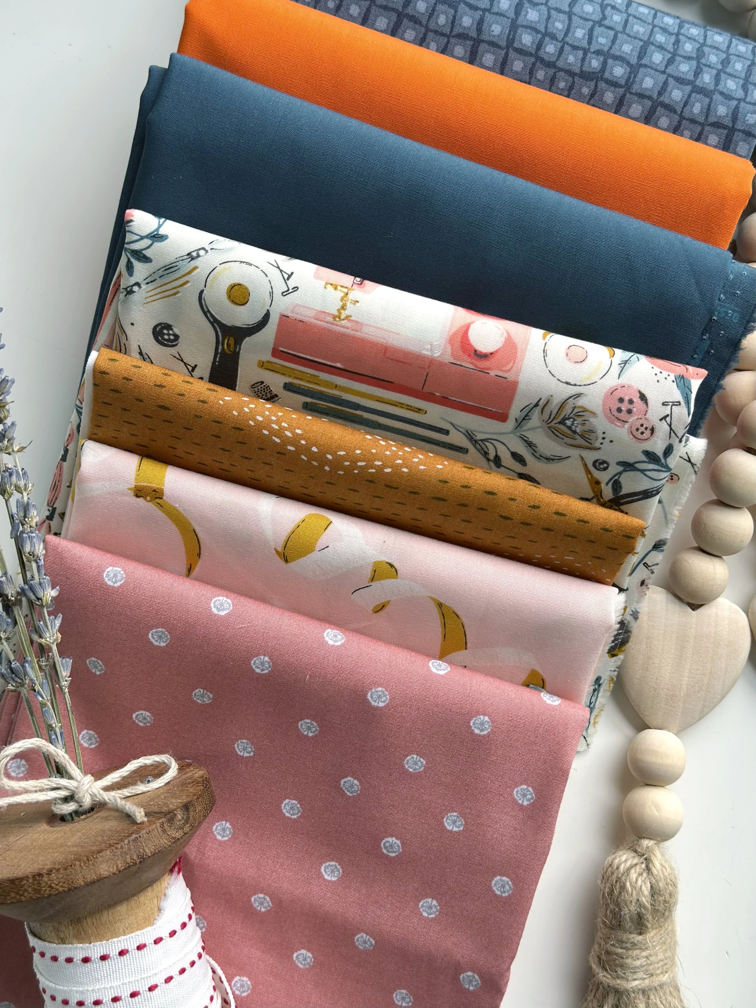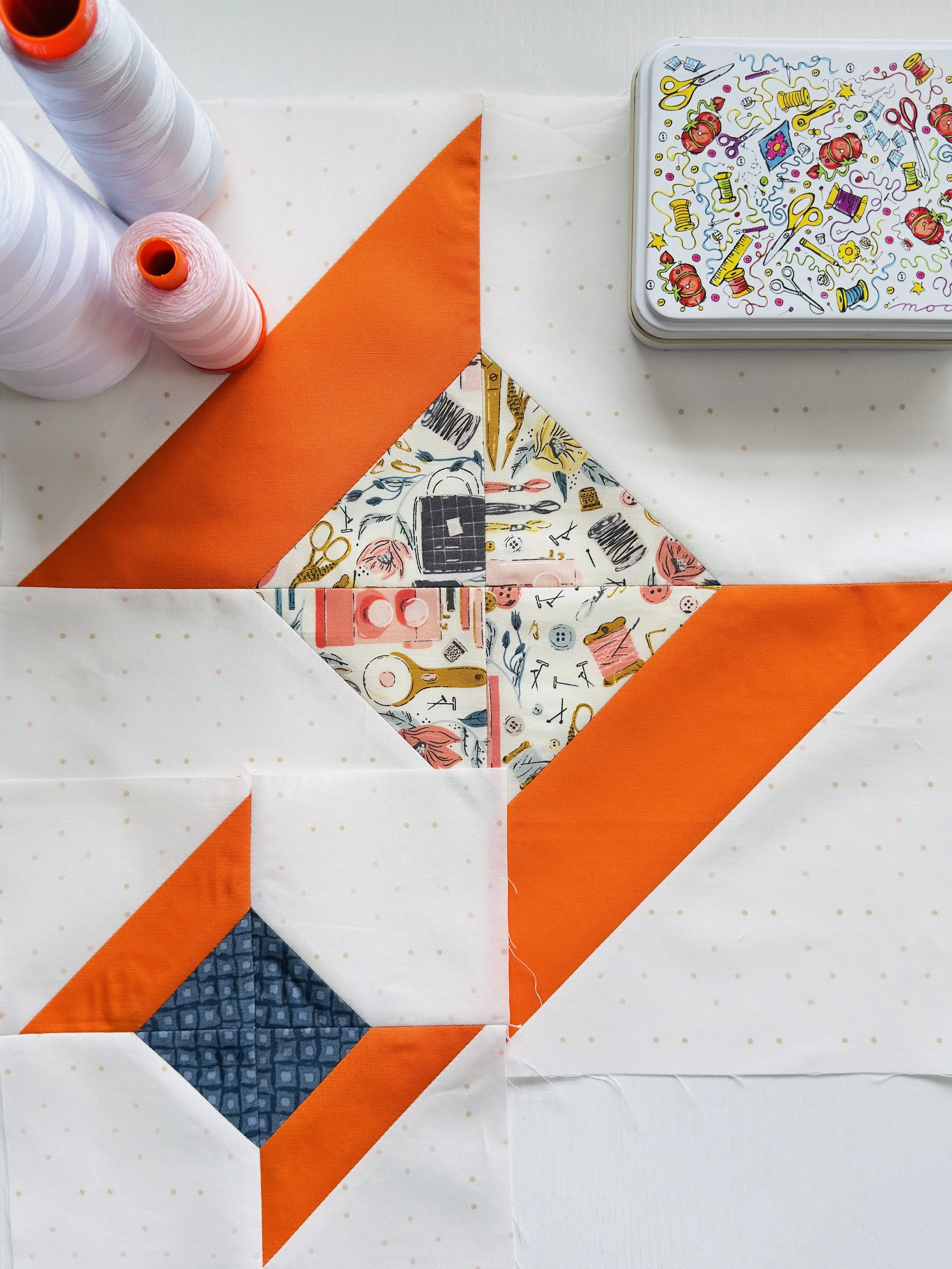 You may have noticed there are small spools and large spool blocks in this quilt and they are turned to create a dynamic movement and energy to the quilt design. I love that Joyce incorporated sewing themed prints into her quilt and used the signature Aurifuil orange spools!