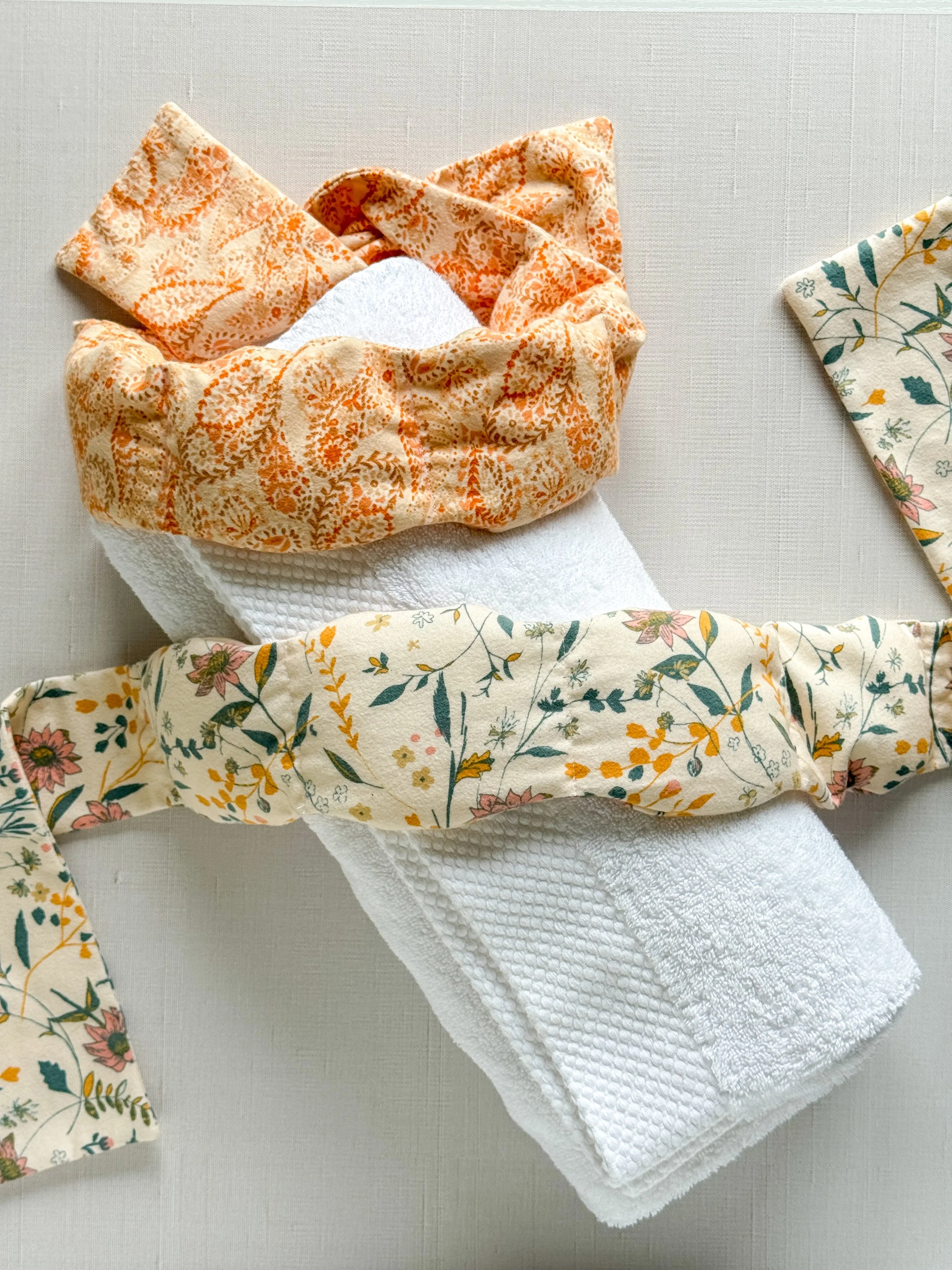 The Weighted Therapy Mask promotes sleep and relaxation through gentle, evenly distributed weight rather than relying on heat or aroma therapy. Thoughtfully filled with BPA-free polyethylene plastic stuffing pellets (Amazon affiliate link for pellets I used) to provide just the right amount of inherently cool, soothing weight, the therapy mask can also be chilled in the freezer for extra cooling relief while still effectively blocking out light and reducing some ambient sound when draped across the eyes and ears. For flexible comfort, the mask can be loosely tied behind the head or simply placed across the eyes, laid over the shoulders and neck, or even rested on the upper chest to deliver a calming, weighted sense of serenity. The mask can be worn by both back and side sleepers. One size fits almost everyone. I even had my husband try it on for size and tie around his head and it was plenty generous a fit.